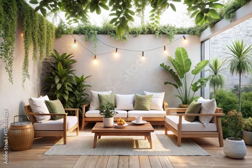 Minimalist Outdoor Living Area with White Walls and Wood Accents - Stylish Bokeh Effect for Modern Home Design Inspiration