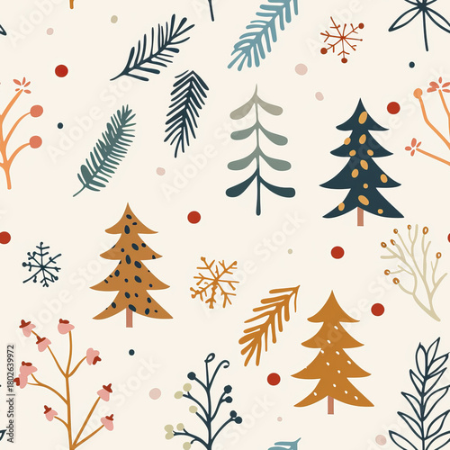 Minimalist Scandinavian Christmas seamless pattern tiny hand-drawn icons holly leaves pine sprigs geometric trees snowflakes warm colors soft cream background clean modern nordic aesthetic