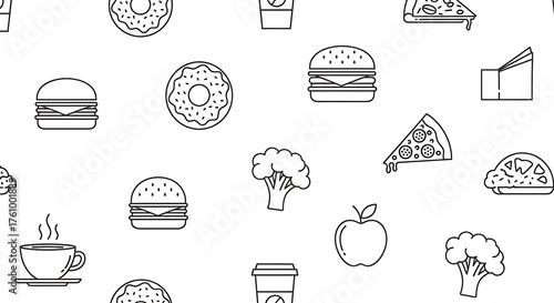 Minimalist seamless pattern background of various food and drink line art icons on white