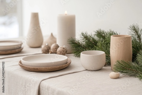 Minimalist table setting features neutral tones with natural ele