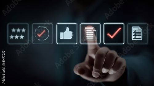 Minimalist UI mockup showing quality rating icons, certification tiles, approval steps, a performance dashboard, and a modular management system checklist