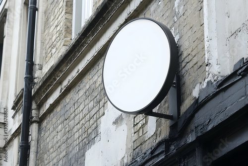 Minimalist White Circular Sign on Brick Building Facade for Branding and Advertising, Ideal for Mockups and Design Presentation across Urban Environments