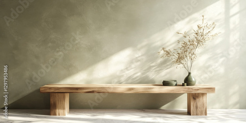 minimalist wooden bench against textured green wall, featuring vase with dried flowers and small bowls, creating serene atmosphere