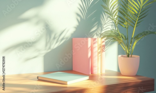 Minimalist workspace featuring a sleek wooden desk, pastel-colored notebooks, and a potted plant placed neatly under natural light.