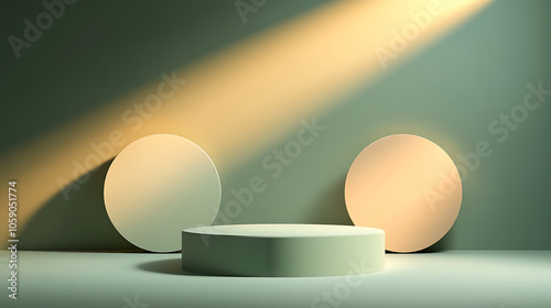 Minimalistic 3D podium design featuring three geometric shapes and soft lighting