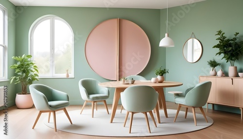 Mint color chairs surround a round wooden dining table in a room with a sofa and a cabinet near a green wall, showcasing Scandinavian home interior design