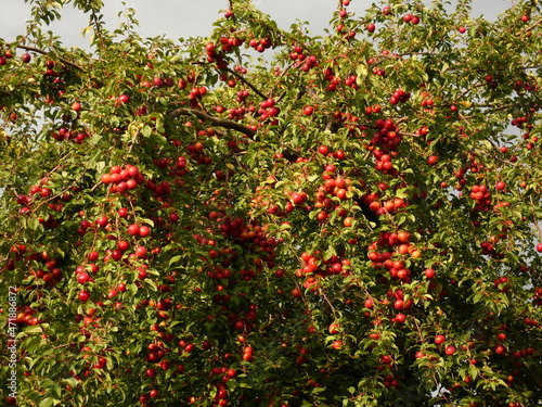 Mirabelle plum (Prunus domestica subsp. syriaca) - mirabelle tree with abundant red fruits, Gdansk, Poland