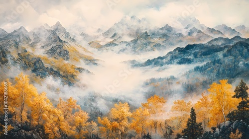Misty autumn mountain scenery, with vibrant fall colors and fog enveloping the trees and peaks, perfect for reflective nature stock visuals.