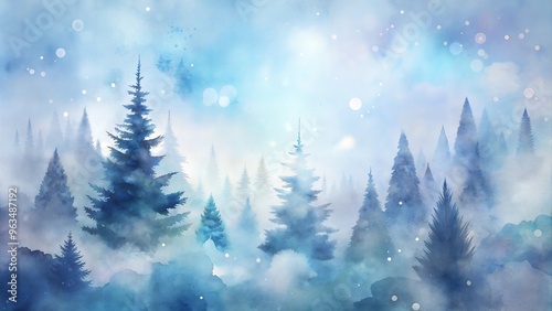 Misty forest landscape with watercolor trees and soft blue tones featuring copy space