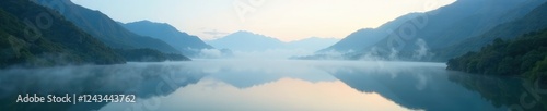 Misty morning at a serene lake in the mountains of Galapagos, serene, foggy