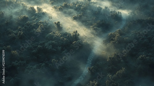 Misty path through a forest; fog and sun rays at dawn create ethereal effect