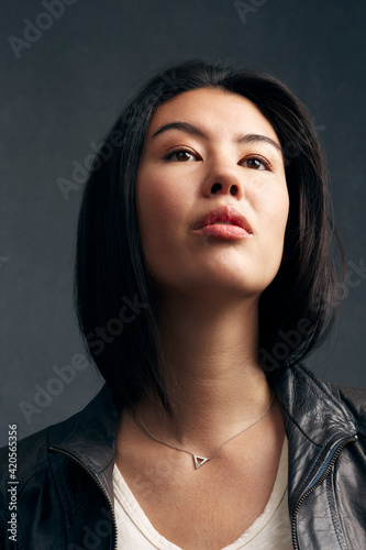 Mixed Race Asian Woman In Studio Photographed From A Low Angle