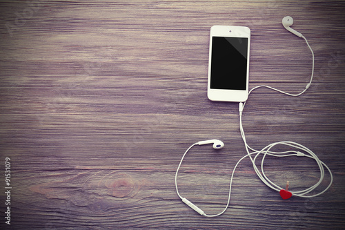 Mobile phone and earphones with red heart on wooden background