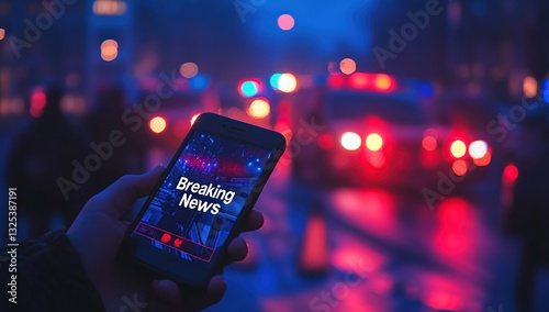 Mobile Phone Displays Breaking News Alerts at Night in City