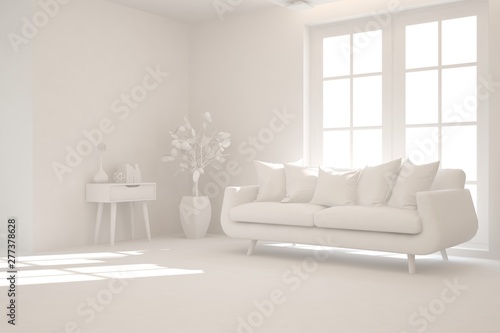 Mock up of stylish room in white color with sofa. Scandinavian interior design. 3D illustration