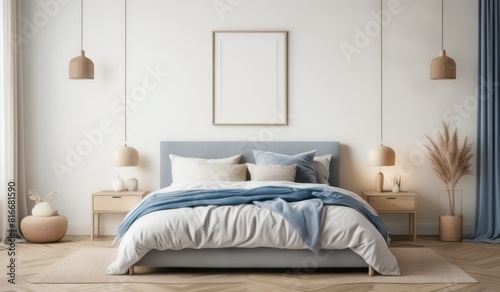 Mockup white poster frame on the wall. Bed with blue and beige bedding. Boho, farmhouse interior design of modern bedroom.