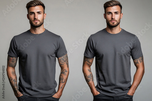 Model showcases casual gray t-shirt with arms crossed and relaxed stance in a studio setup