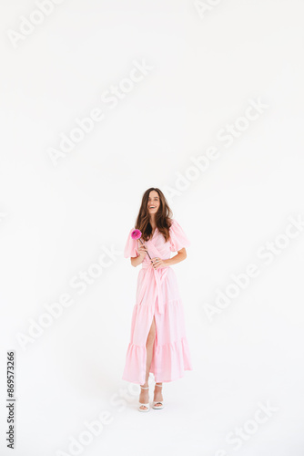 Model wearing casual outfit. Look in trendy minimalistic style. Pink dress with slit, belt, puff sleeves. Sexy sensual happy woman. Positive woman turn around and hold pink flower on white background.