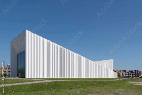 Modern architectural structure with sharp angles and white facade contrasted by clear blue sky in a vibrant urban setting surrounded by green grass