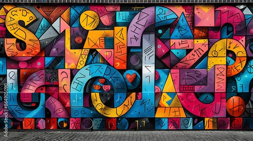 Modern art mural featuring abstract typography, letters and words distorted and arranged artistically.