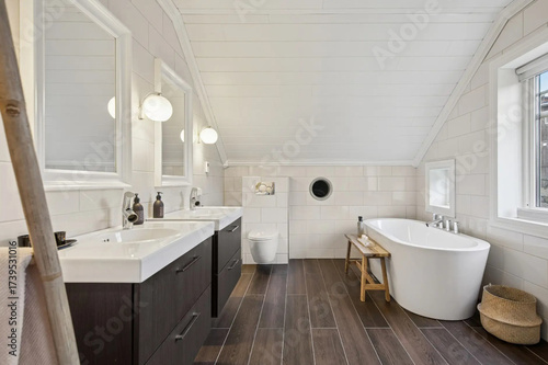 Modern bathroom interior in minimal scandinavian style, 3d render