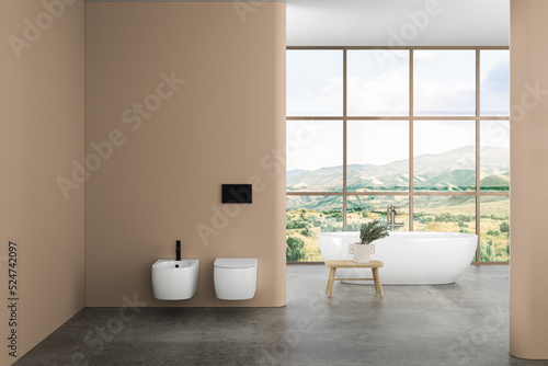 Modern bathroom interior with beige walls, ceramic basin with oval mirror, bathtub and grey concrete floor. Minimalist beige bathroom with modern furniture. 3D rendering