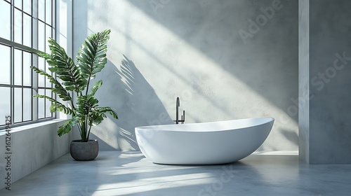 Modern Bathroom Interior with Freestanding Tub, Potted Plant, Natural Light, and Textured Gray Walls