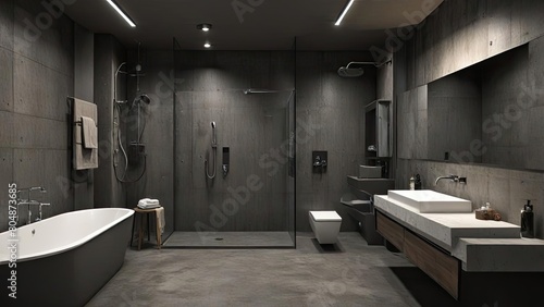 Modern bathroom interior with shower and mirror using an industrial concept