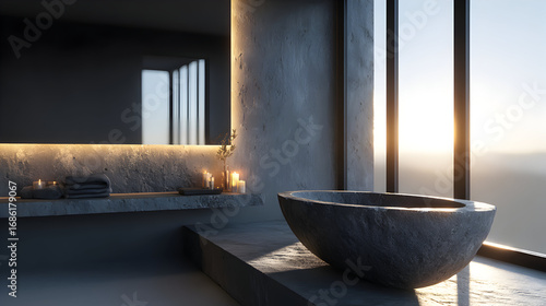 Modern bathroom with stone bathtub and large window overlooking a sunrise.