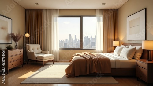 Modern bedroom with city view.