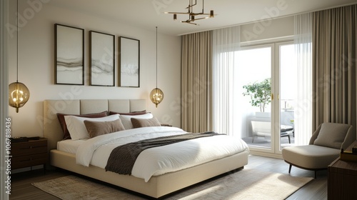 Modern Bedroom with Large Bed, White Bedding, and Artwork