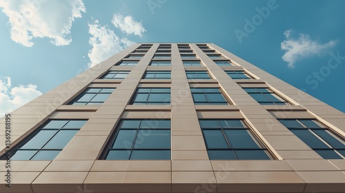 Modern Beige Office Building Exterior with Glass Windows Against a Blue Sky