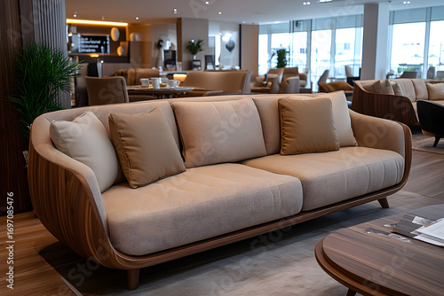 Modern beige sofa with wooden frame in a stylish interior