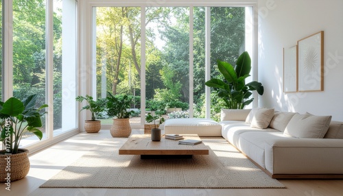 Modern Biophilic Living Room Interior with Natural Light and Plants
