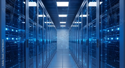 Modern blue server room corridor with glowing lights