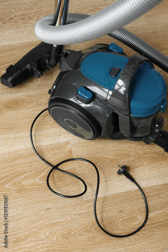 Modern blue vacuum cleaner on the wooden floor in living room. Heart Shape. Clean House Concept. Close-up