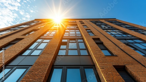Modern Brick Building with Windows Under Clear Blue Sky and Bright Sunlight in Urban Setting
