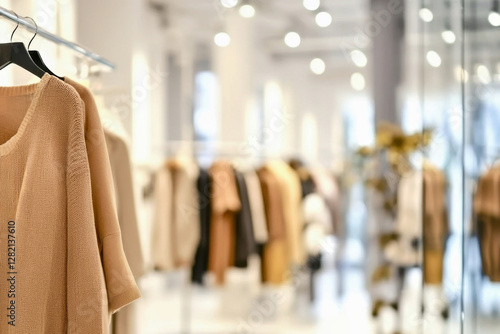 Modern bright clothing store interior with pastel colors clothes on racks and big mirrors