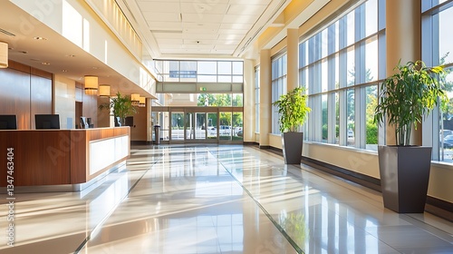 Modern, bright lobby with large windows, reception desk and plants