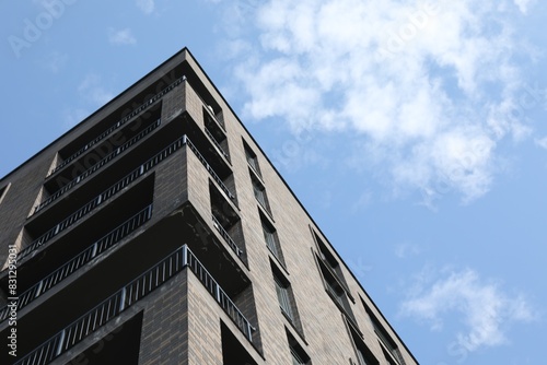 Modern building with big windows against blue sky outdoors, low angle view. Space for text