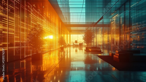 Modern business success represented by glowing digital elements, financial data flows, and corporate office space