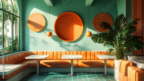 Modern Cafe Interior: An inviting modern cafe interior with vibrant colors, a stylish seating area, and decorative wall features. The ambiance is bright and fresh, illuminated by natural sunlight