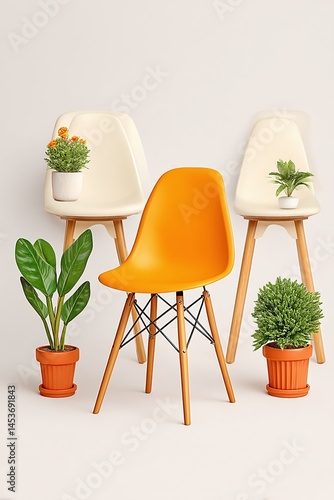 Modern Chairs with Plants Against White Backdrop