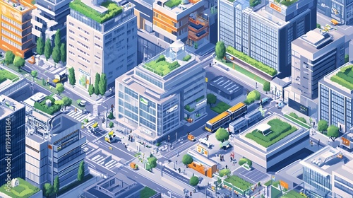 Modern Cityscape Featuring Green Rooftops and Busy Streets