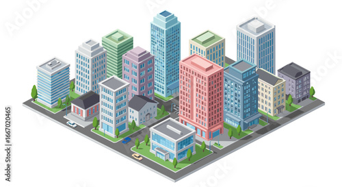 Modern cityscape with isometric skyscrapers and urban architecture