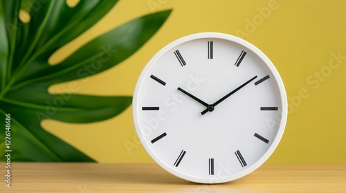 Modern Clock Display Against a Vibrant Yellow Background with Foliage
