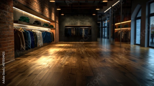 Modern Clothing Store Interior with Wooden Flooring and Exposed Brick Walls
