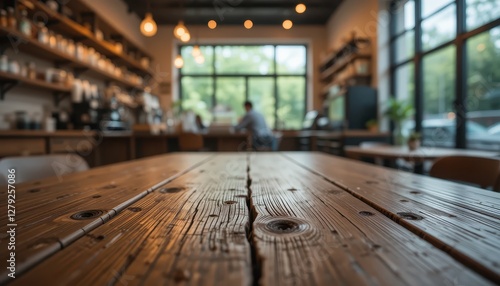 Modern Coffee Shop Interior with Rustic Wooden Table and Soft Lighting