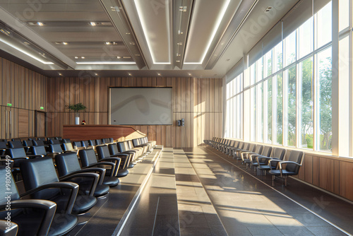 Modern conference room interior with rows of black leather chairs, a wooden wall, large windows, and a projector screen. Generative Ai