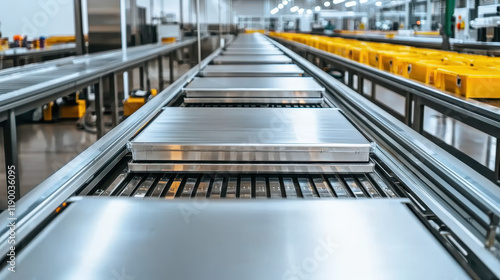 modern conveyor belt system transporting metal trays in warehouse environment, showcasing efficiency and organization